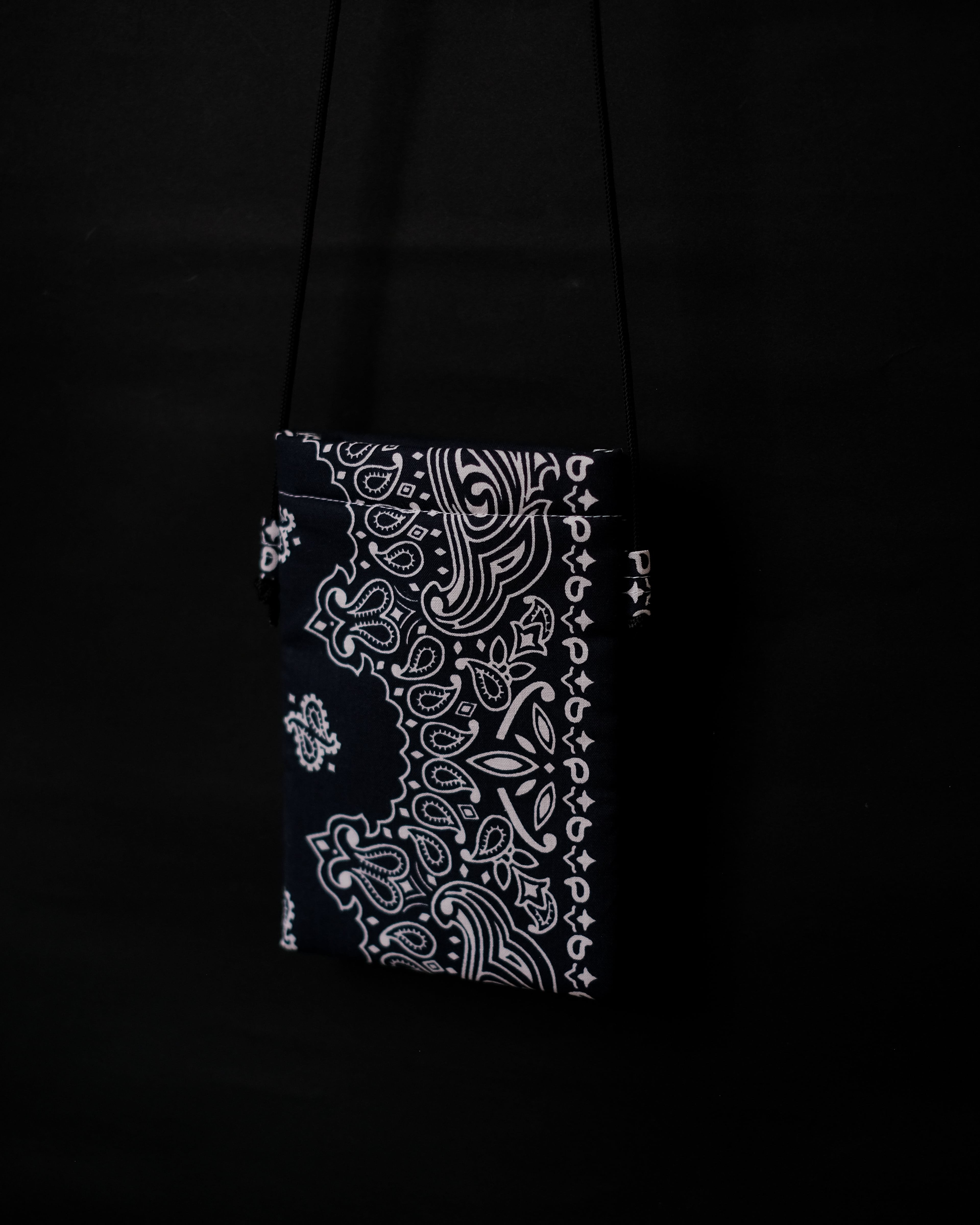 HAV-A-HANK made in USAのバンダナを表面に、撥水ナイロンリップストップを裏面に使用したスマートフォンやガジェットを収納しつつもアクセントにもなるミニマルなショルダーポーチを作成しました。