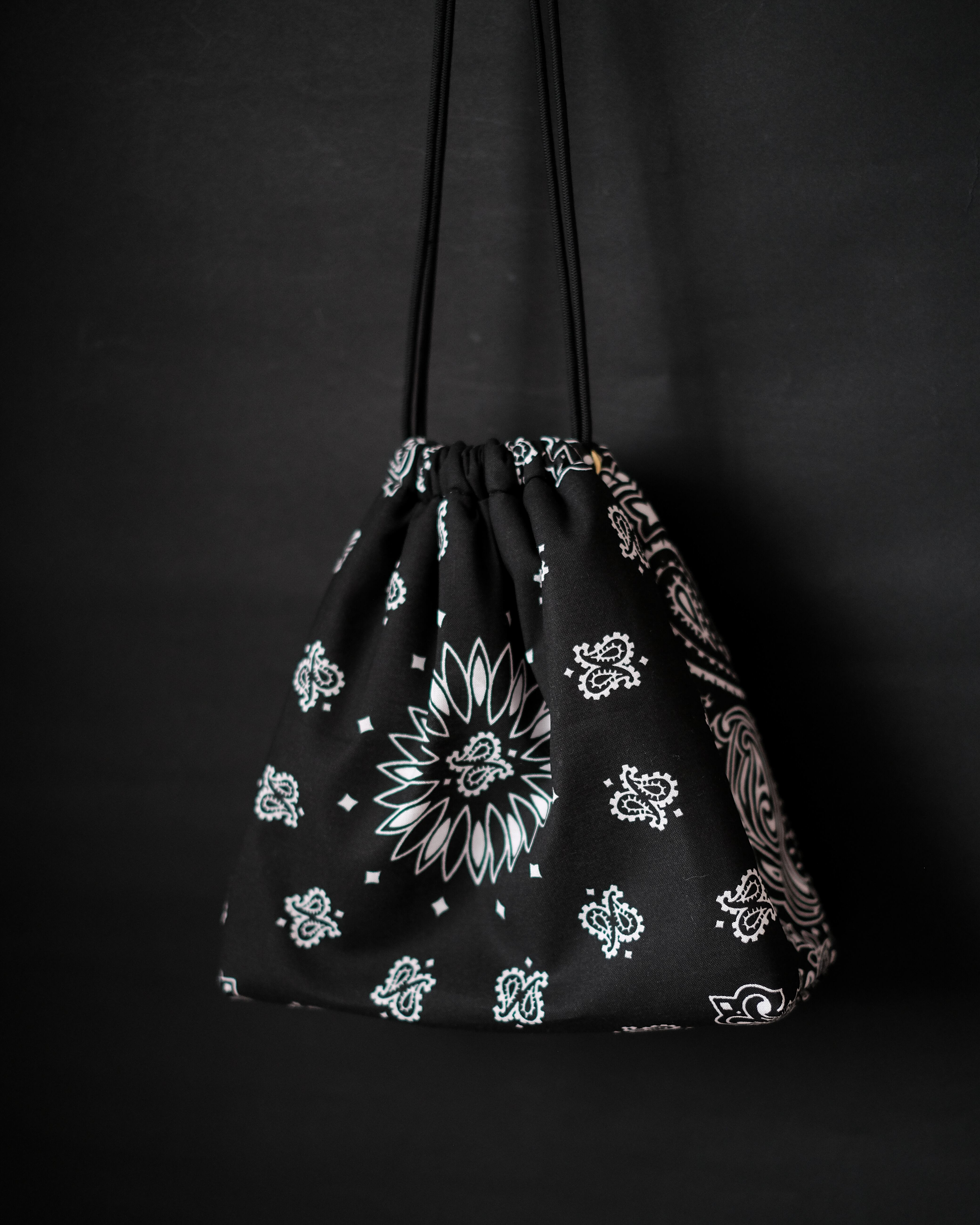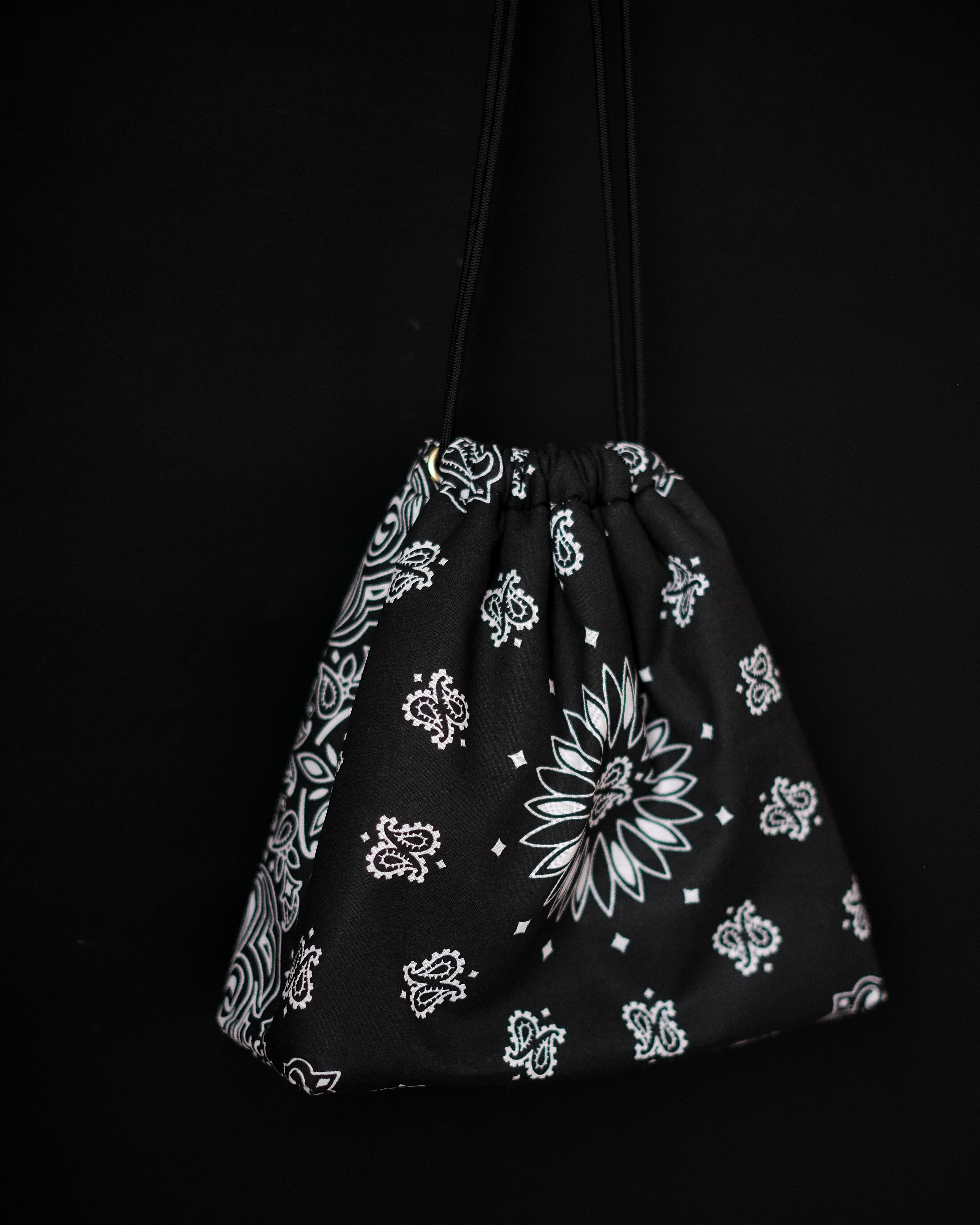 HAV-A-HANK made in USAのバンダナを表面に、撥水ナイロンリップストップを裏面に使用したちょうど良いサイズのマチ付きのドローストリングバッグを作成しました。