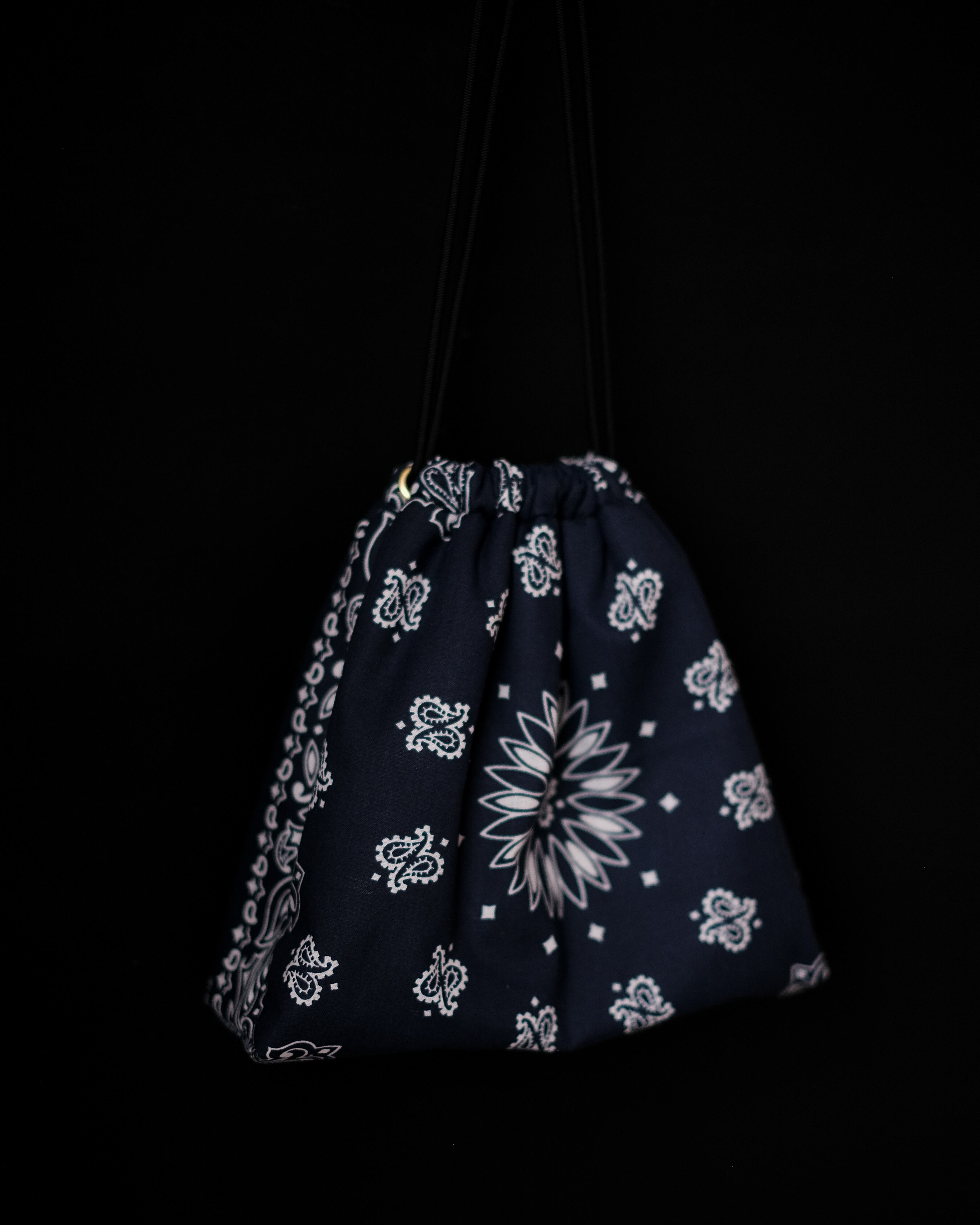 HAV-A-HANK made in USAのバンダナを表面に、撥水ナイロンリップストップを裏面に使用したちょうど良いサイズのマチ付きのドローストリングバッグを作成しました。
