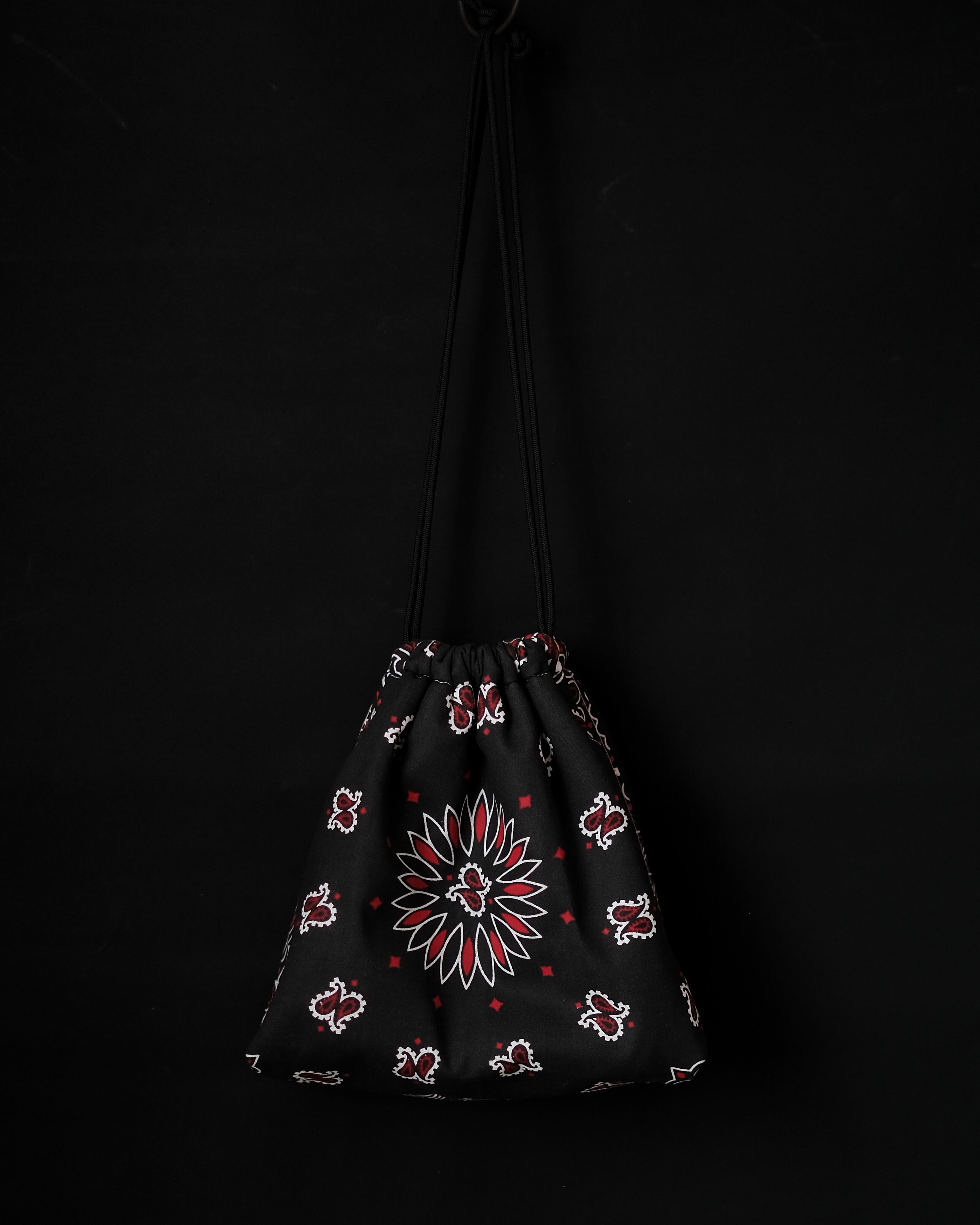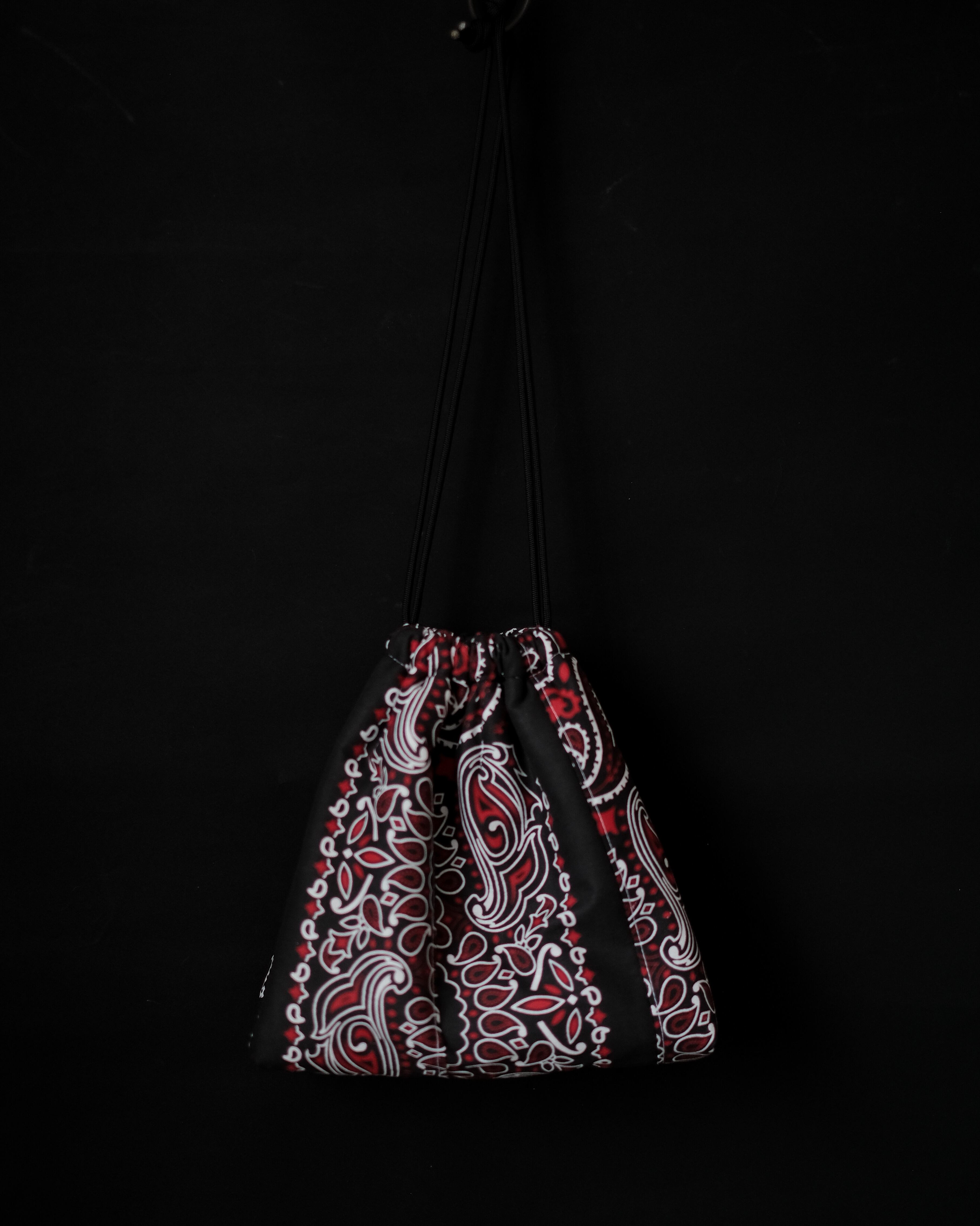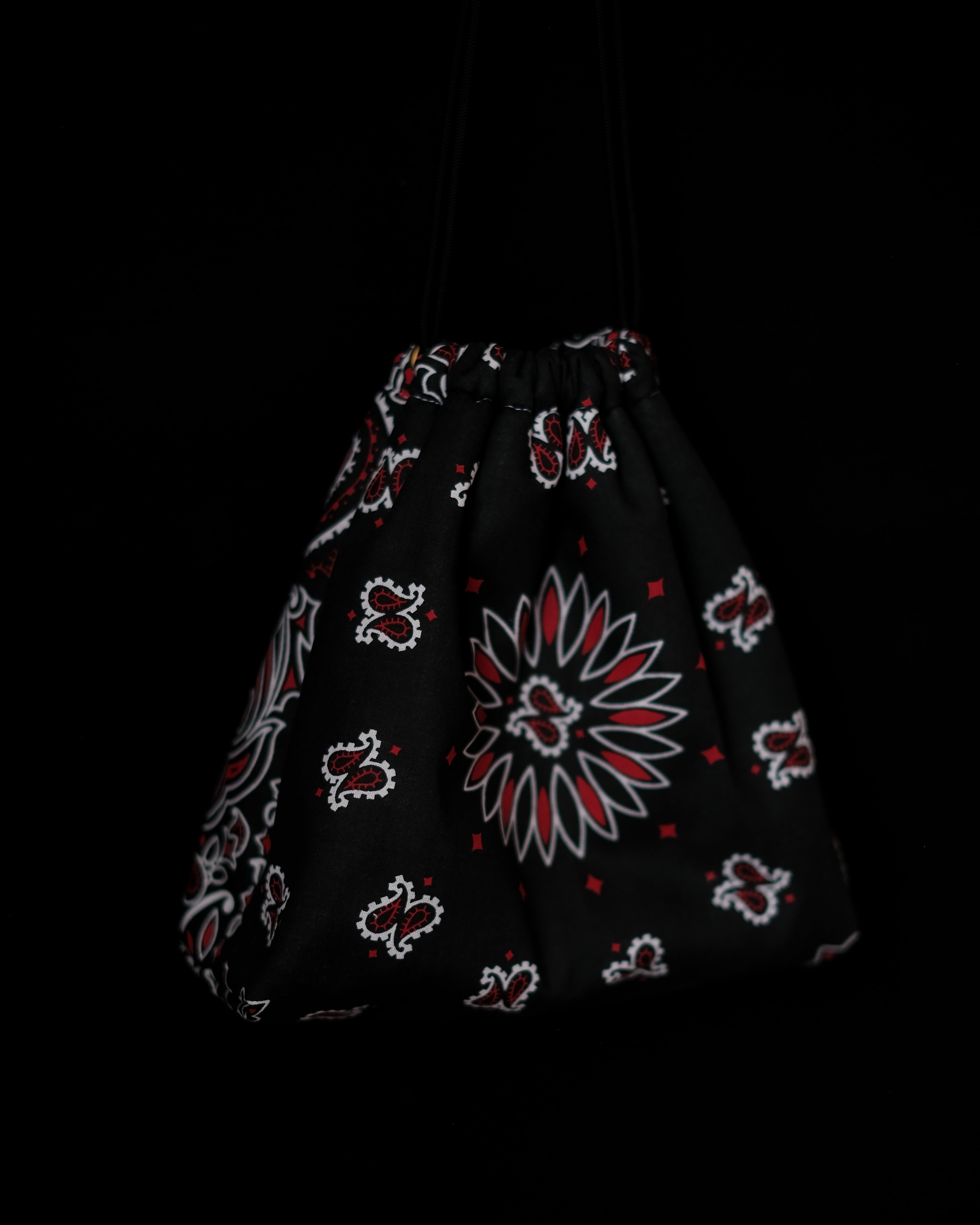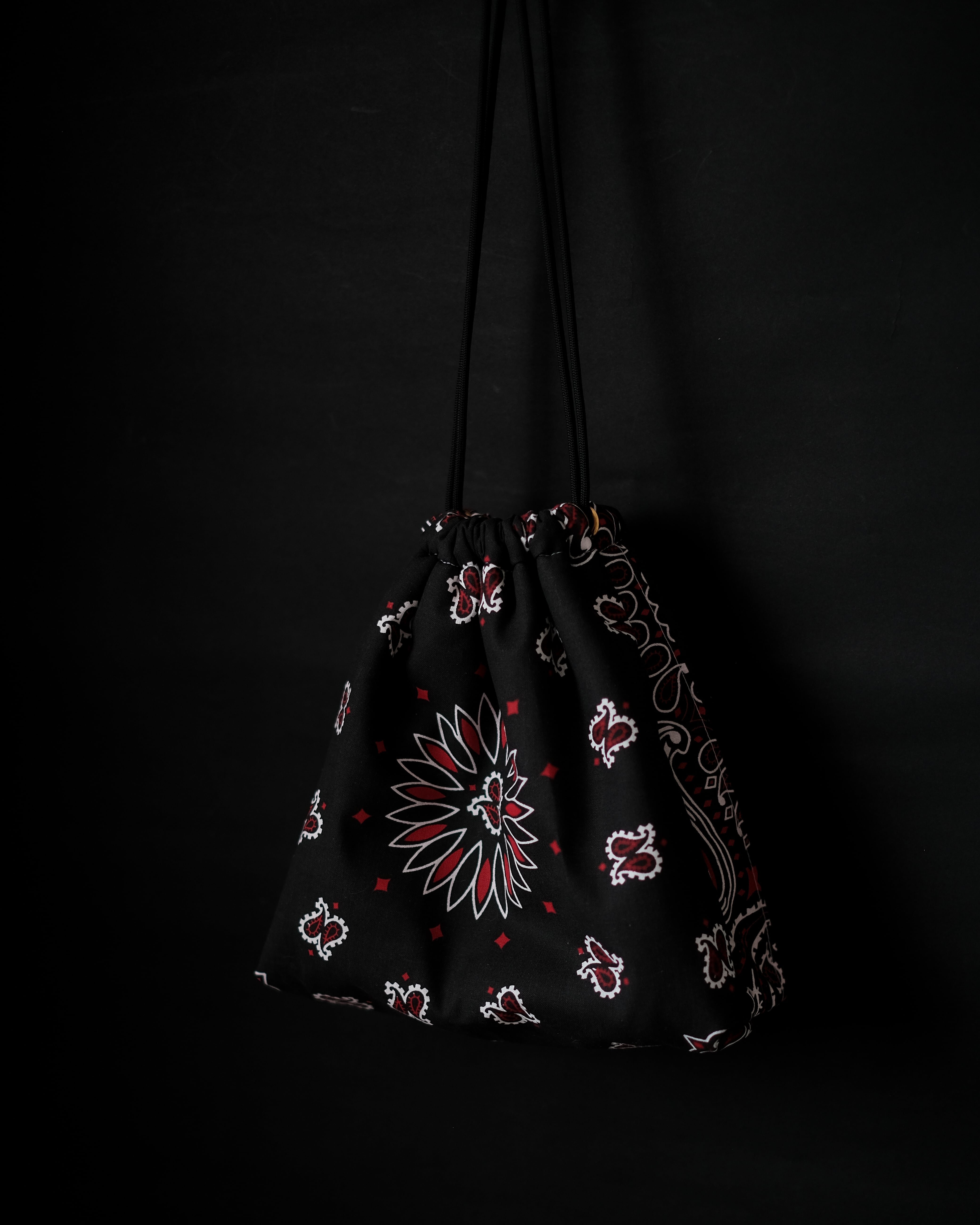 HAV-A-HANK made in USAのバンダナを表面に、撥水ナイロンリップストップを裏面に使用したちょうど良いサイズのマチ付きのドローストリングバッグを作成しました。