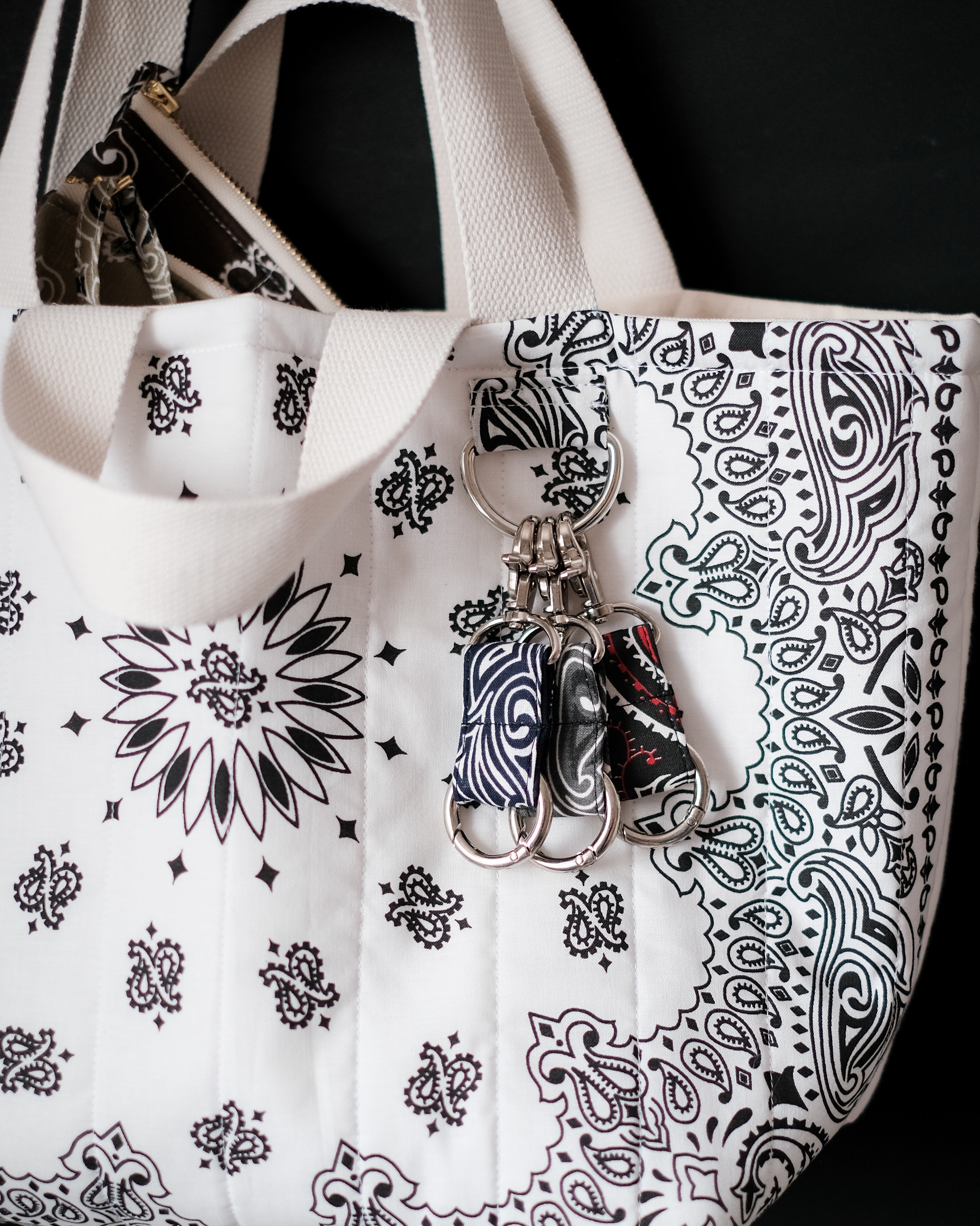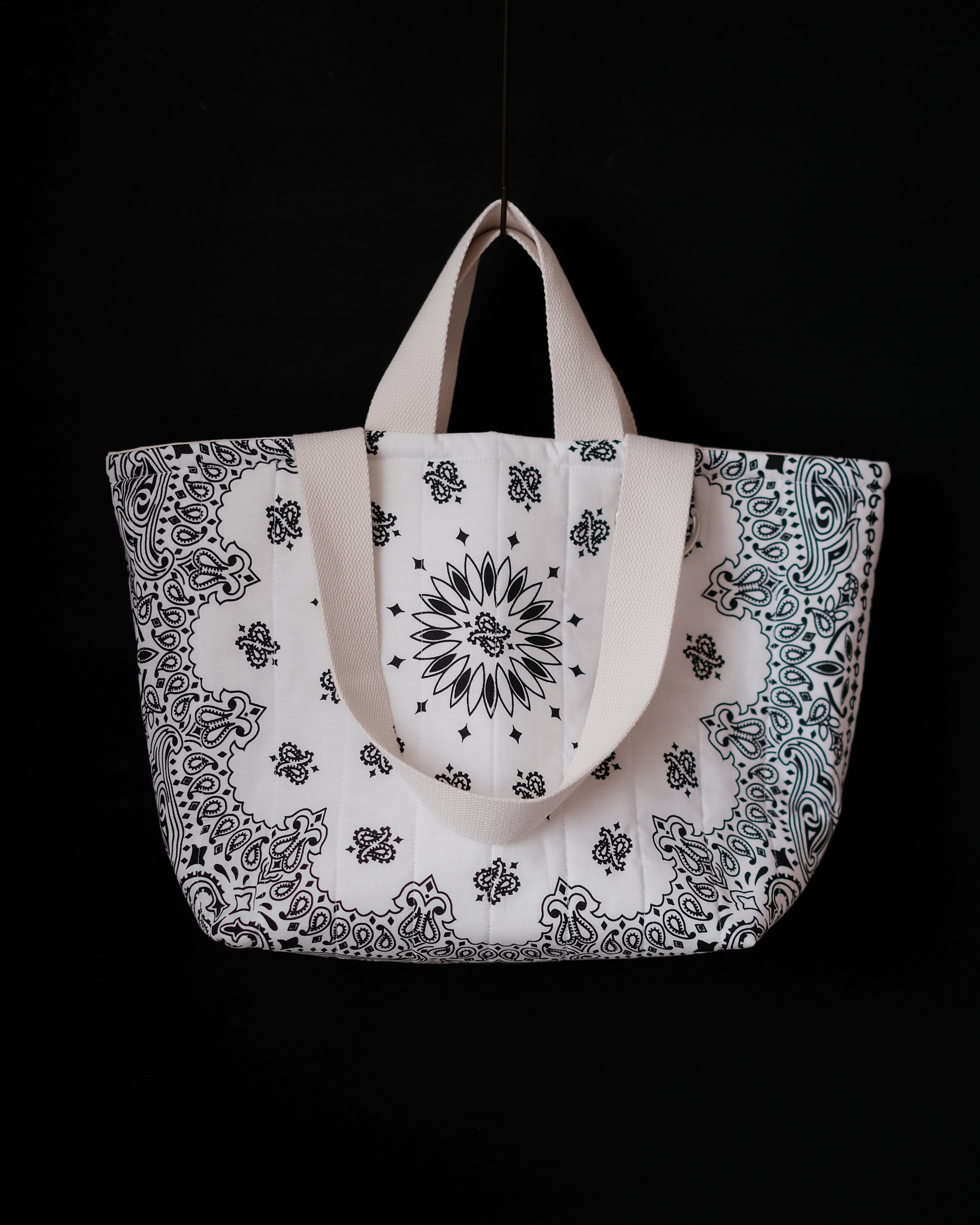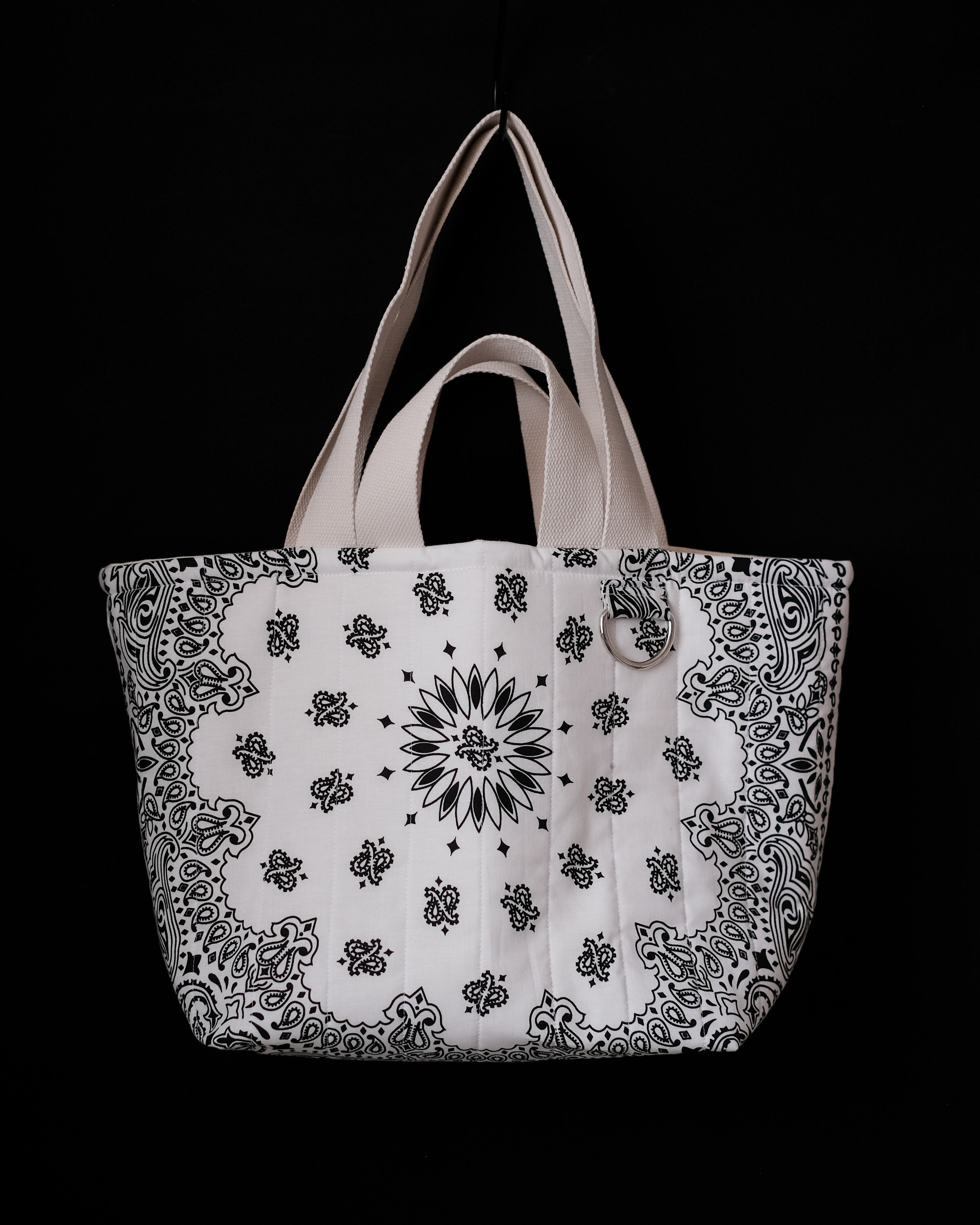 HAV-A-HANK made in USAのバンダナを表面に、撥水ナイロンリップストップを裏面に使用したちょうど良いサイズのマチ付きのベーシックなトートバッグを作成しました。
