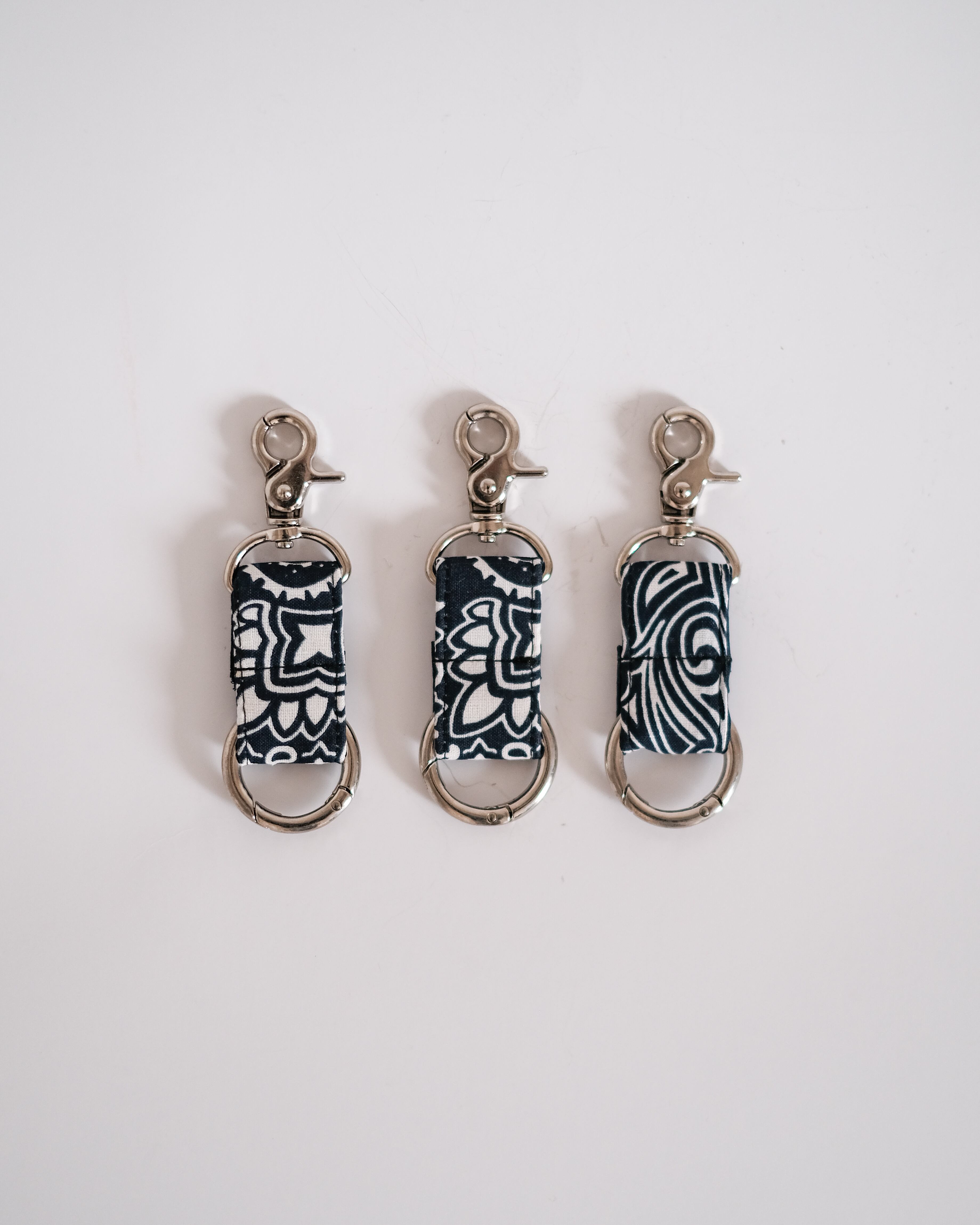 HAV-A-HANK made in USAのバンダナと芯地に鞄の持ち手に使うベルトをもちいた耐久性も備えた使い勝手の良いキーチェーンを作成しました。