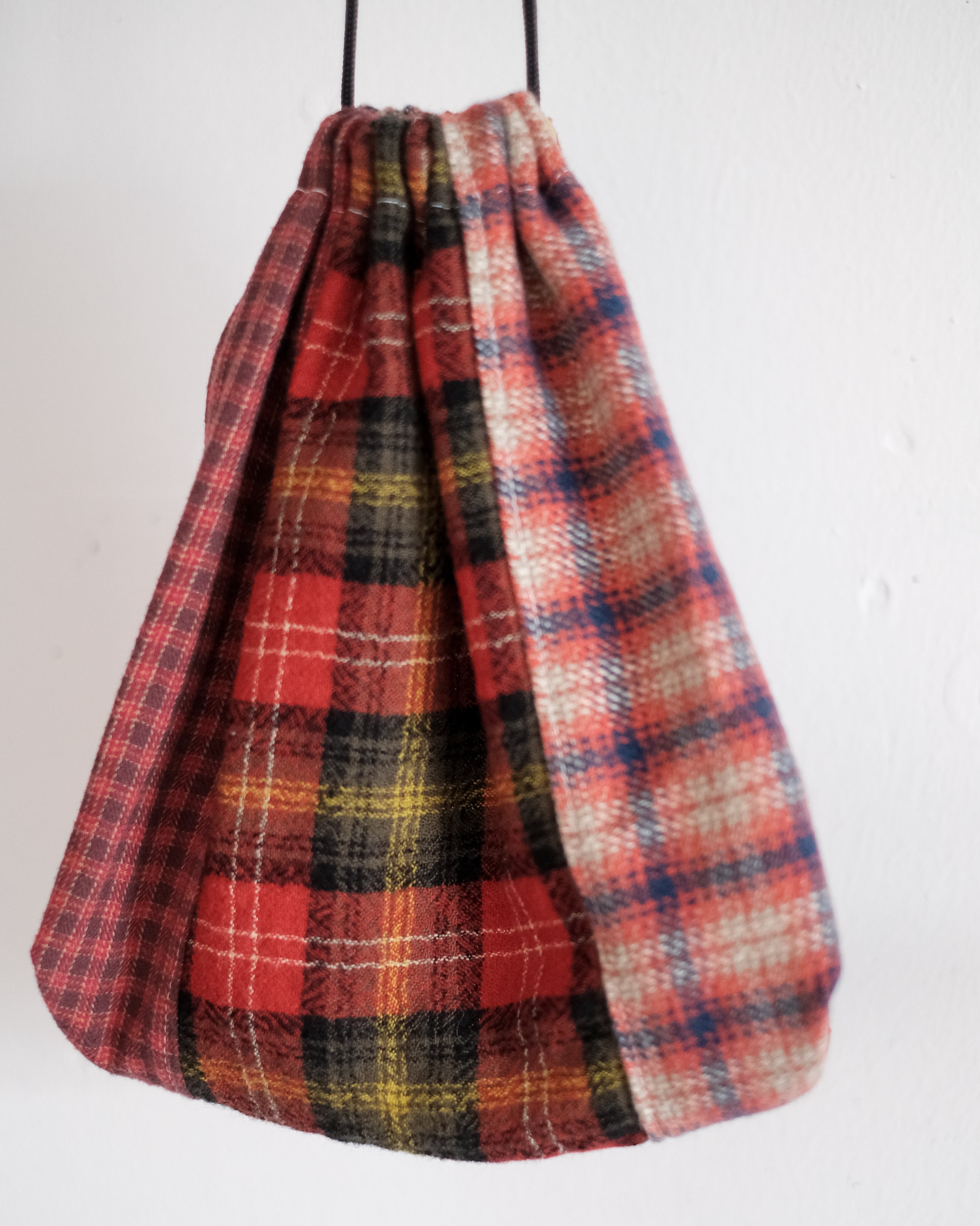 USEDのネルシャツを複数枚、再構築したちょうど良いサイズのマチ付きのドローストリングバッグを作成しました。
