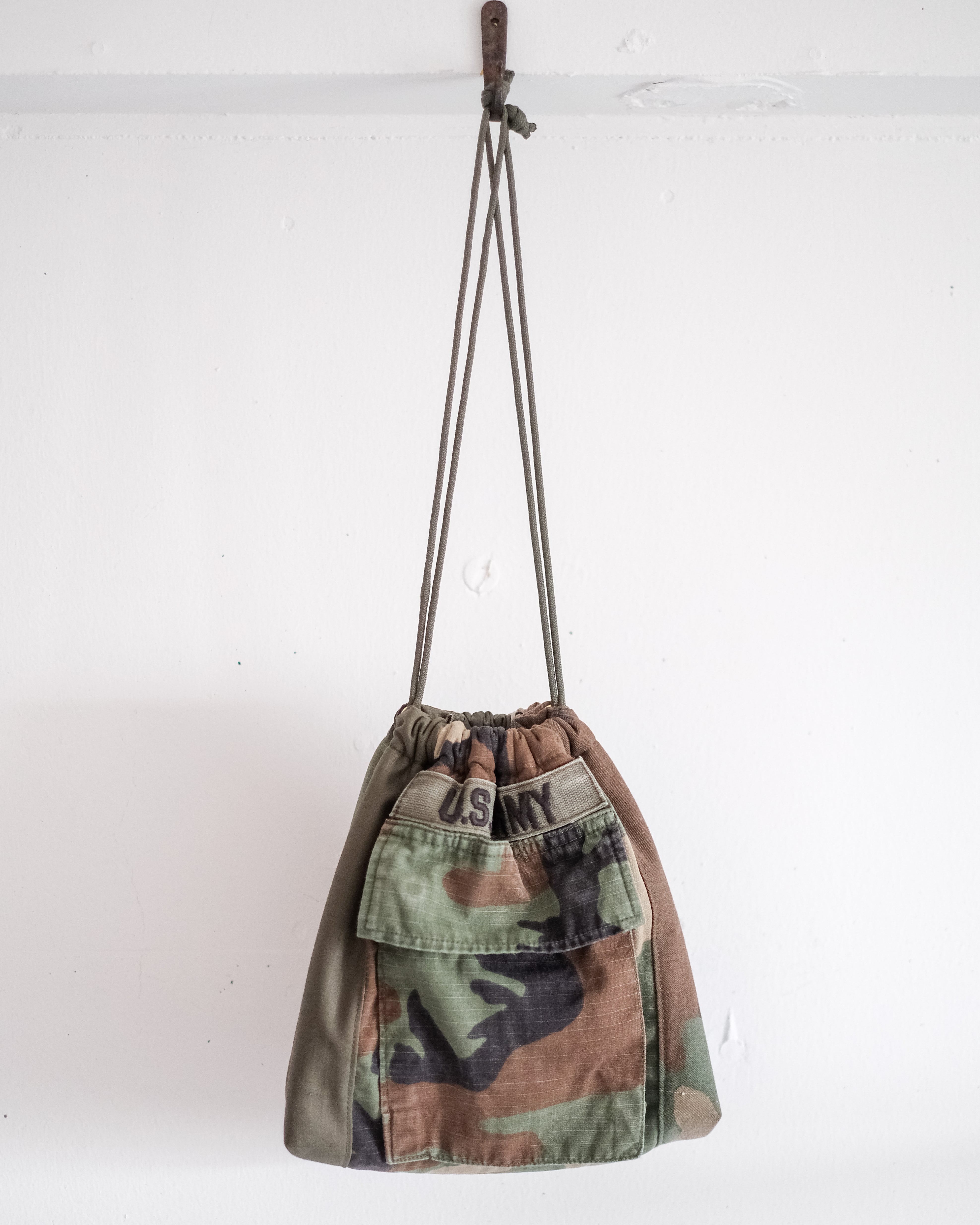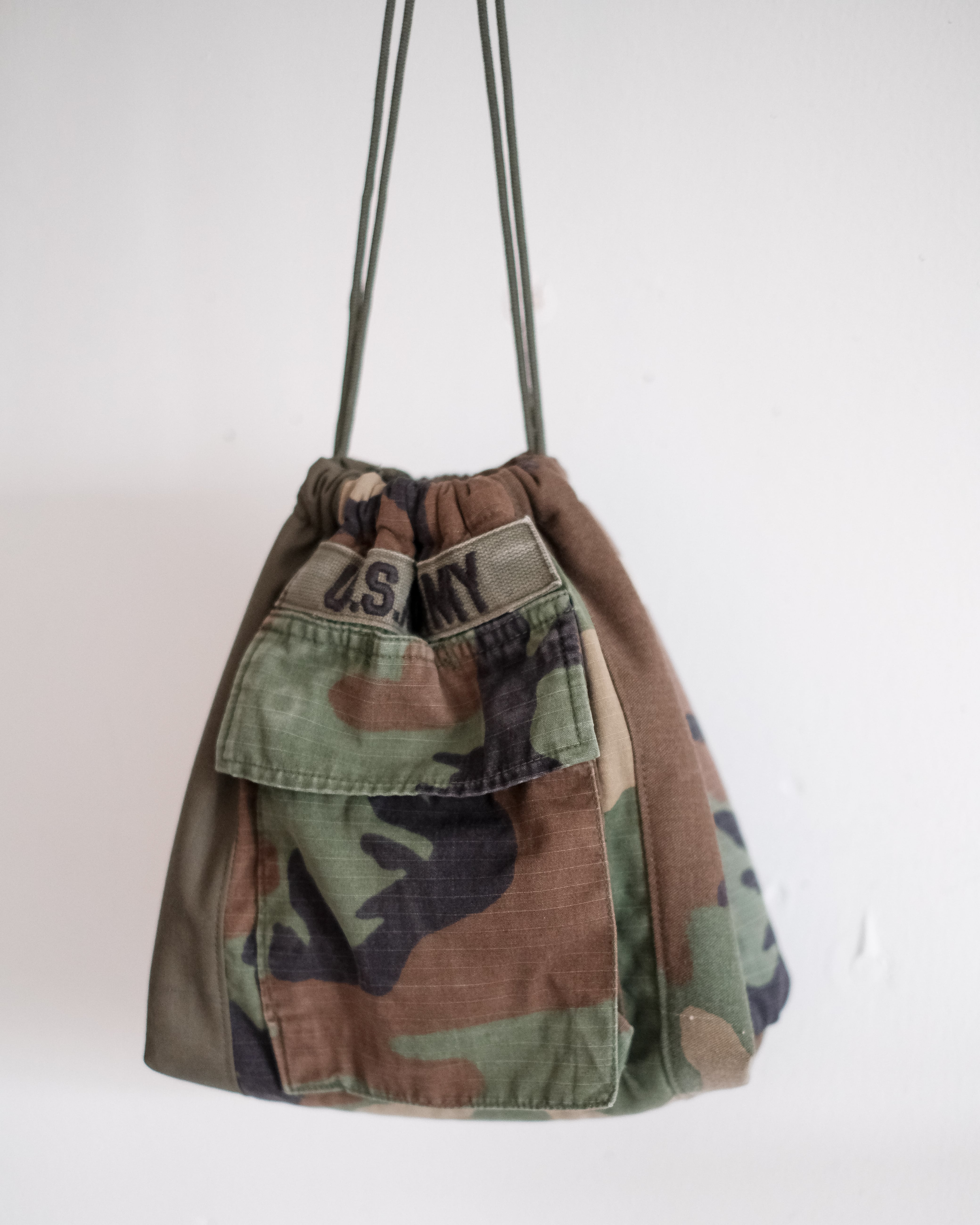Vintageのミリタリージャケット複数枚とリップストップの生地を再構築し、キルト芯入り、マチ付きの程良いサイズ感のベーシックな巾着を作成しました。