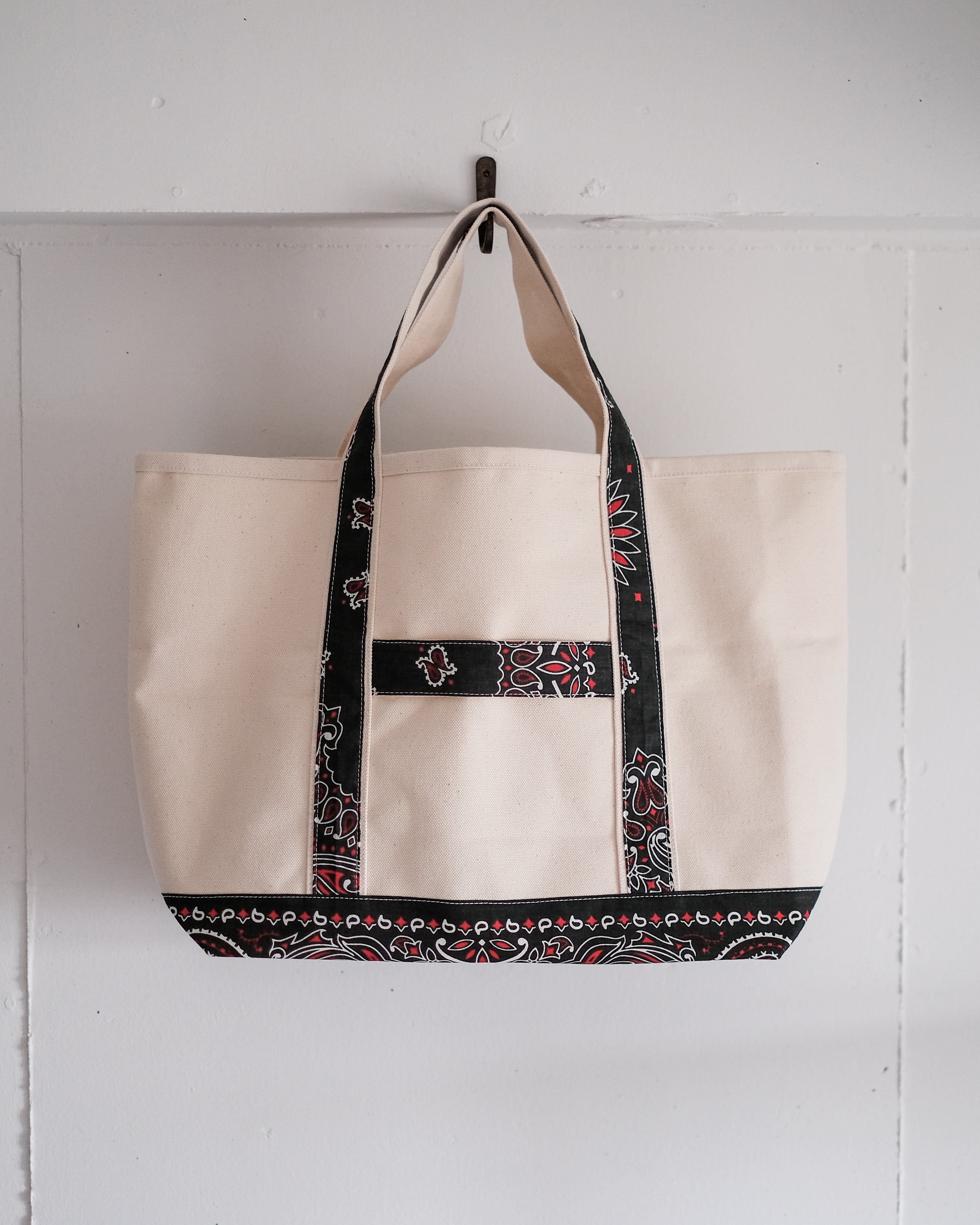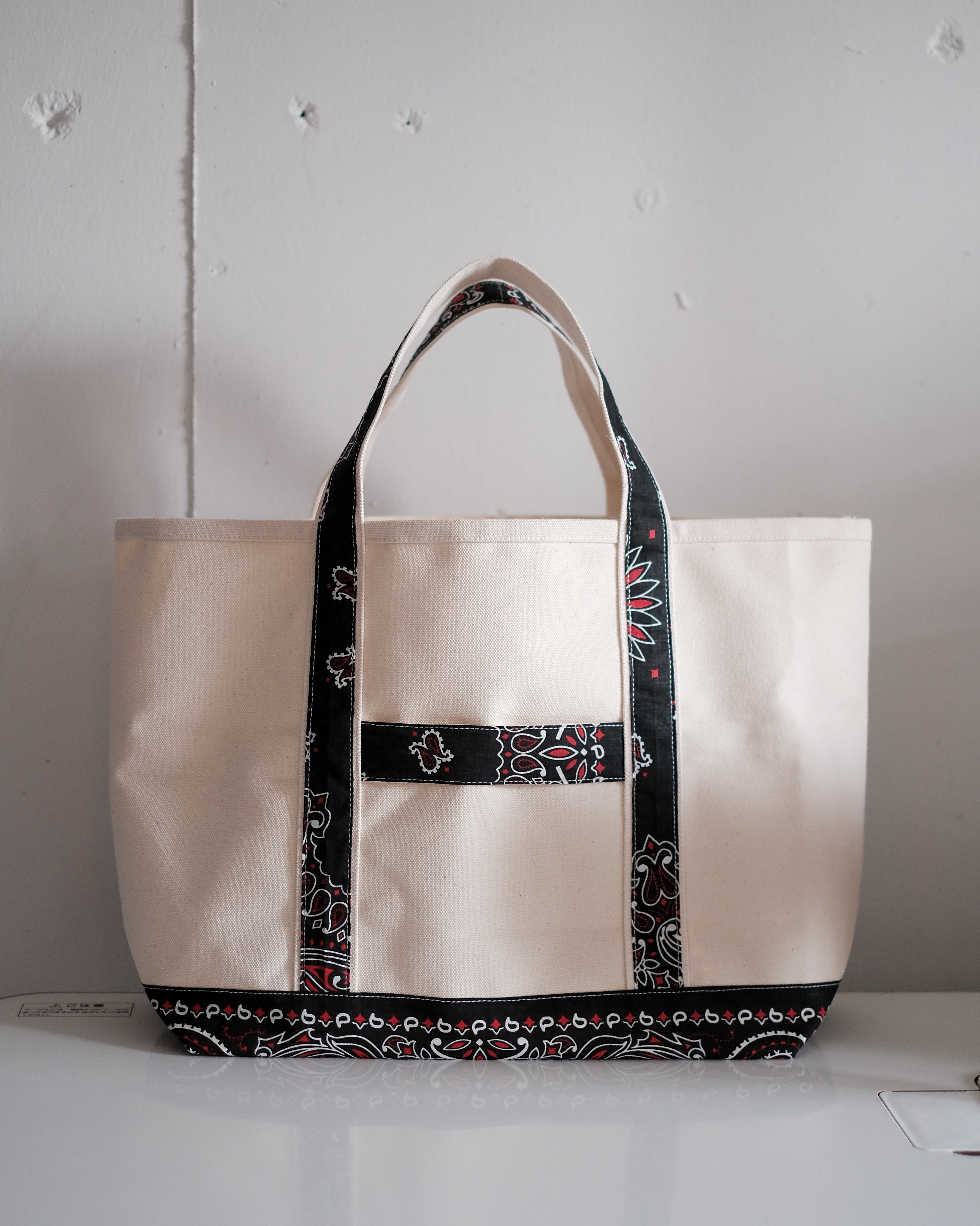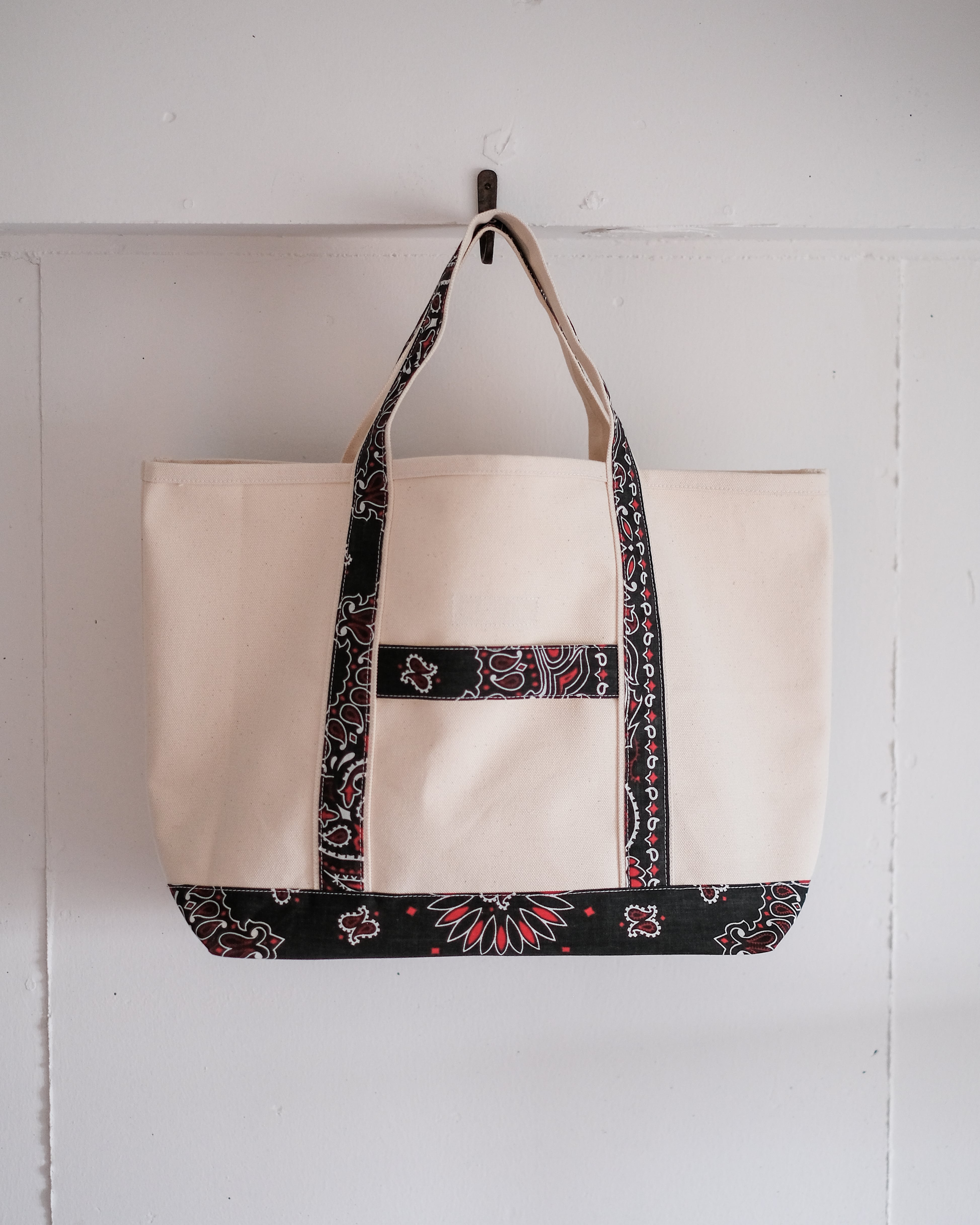 HAV-A-HANK made in USAのバンダナと国産8号の帆布を組み合わせ、ブランドの顔を目指したベーシックな大きめのトートバッグを作成しました。