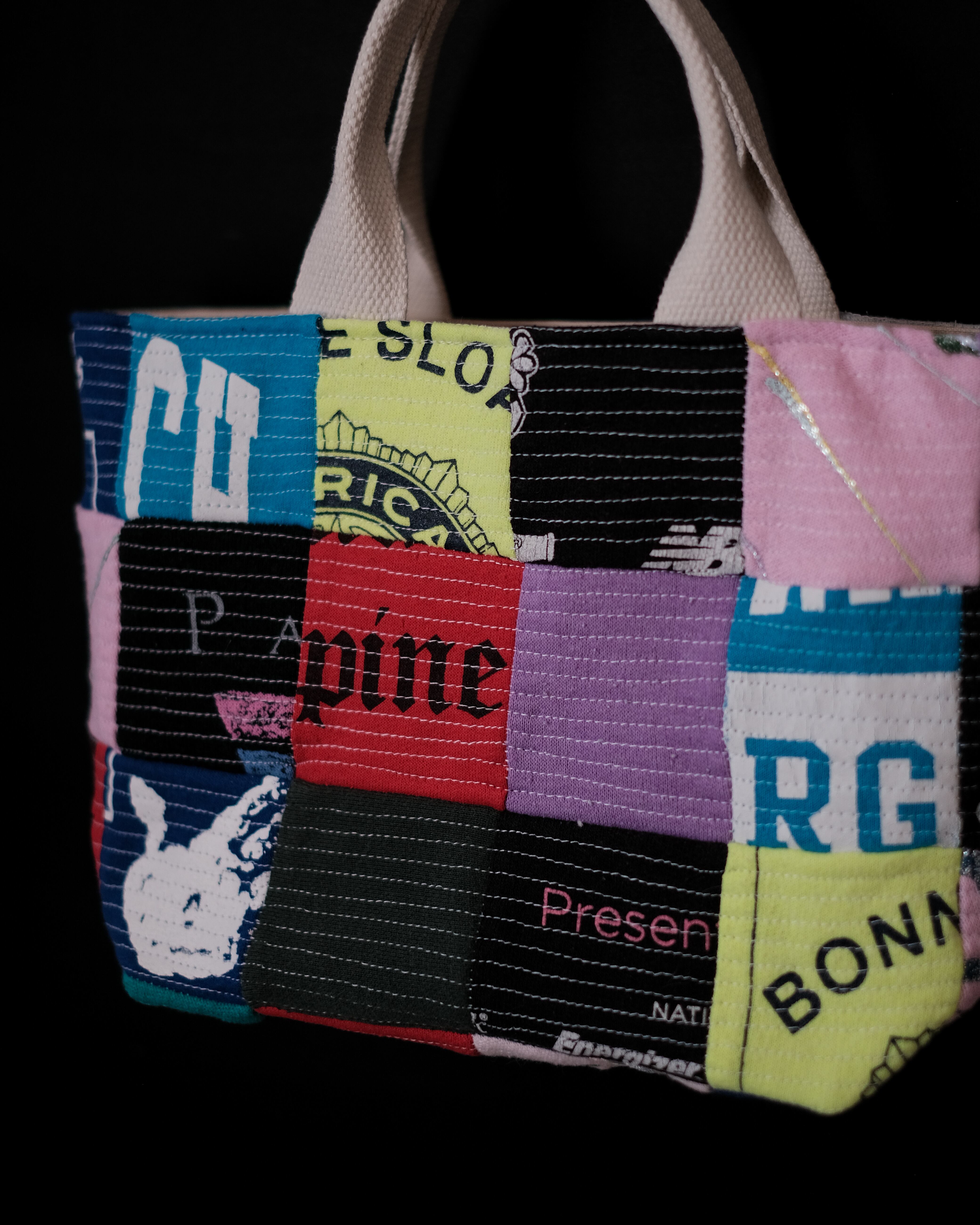 雰囲気のよいUsedのスウェットをパッチワークで再構築し、裏地付きのマチ付きのベーシックなトートバッグを作成しました。